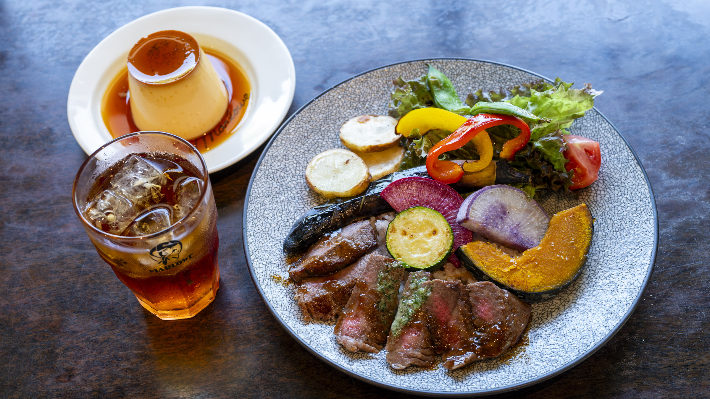 カフェでは、14:00までランチメニューを提供しています。おすすめは「三浦牛と季節野菜のグリルプレート」(3,300円・ライス付き)。