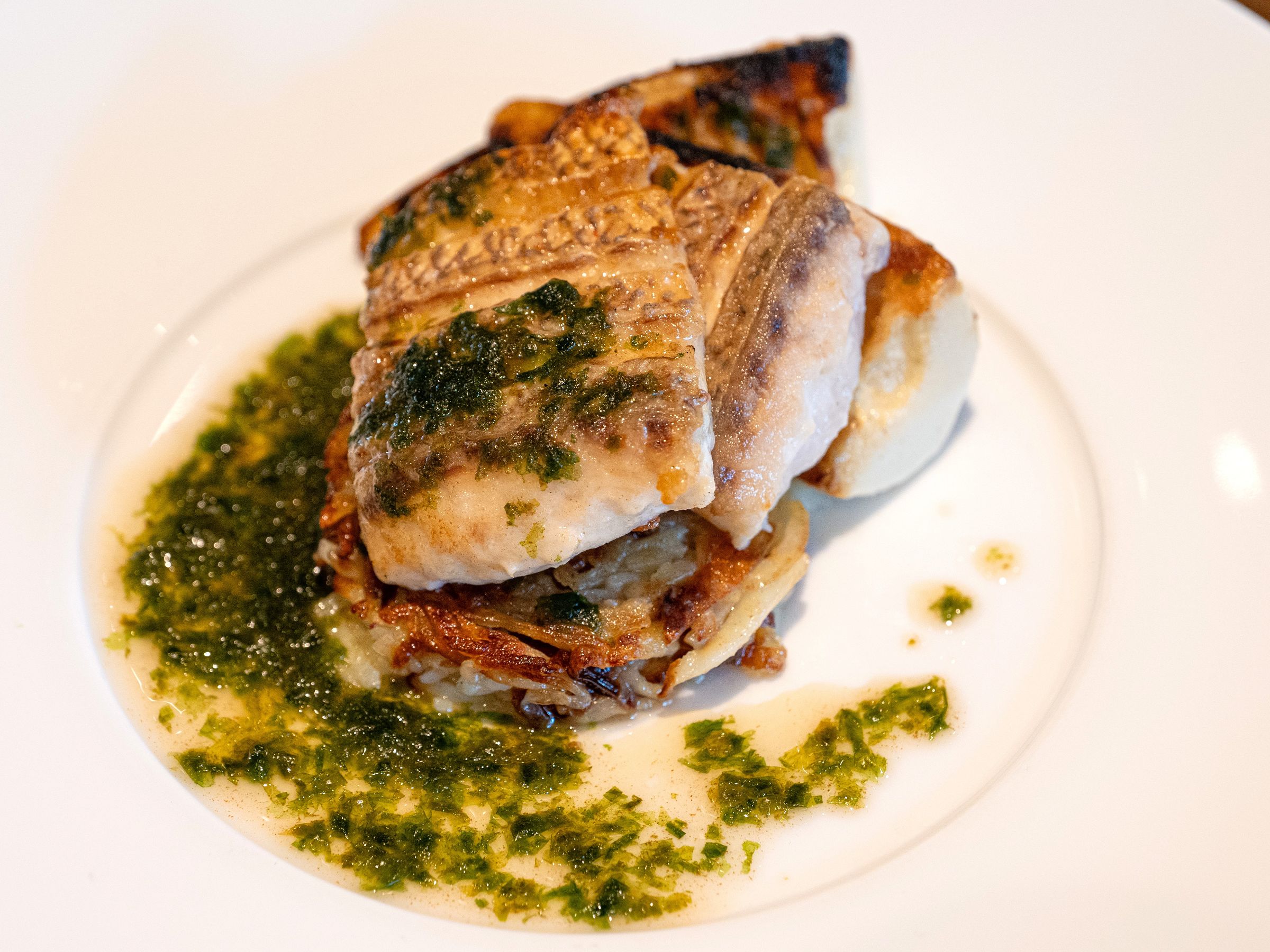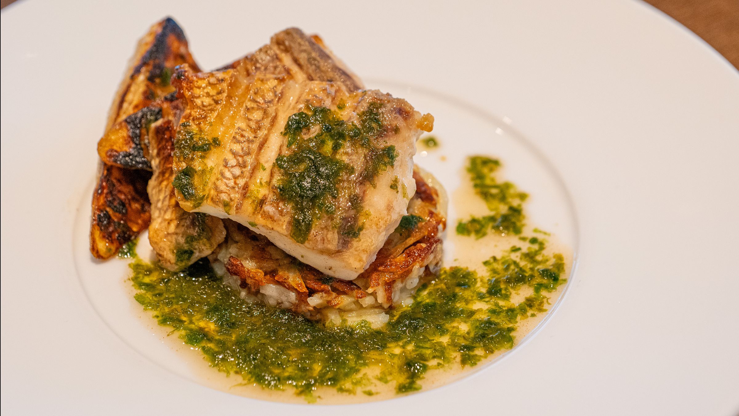 テーブル席に「桜鯛のポワレ」(3,000円)がそっと出されました。桜の季節の赤く染まった、そこへ生海苔のブール・ノワゼットがかけられています。添えられた筍は朝堀りのものなのがうれしいポイント。