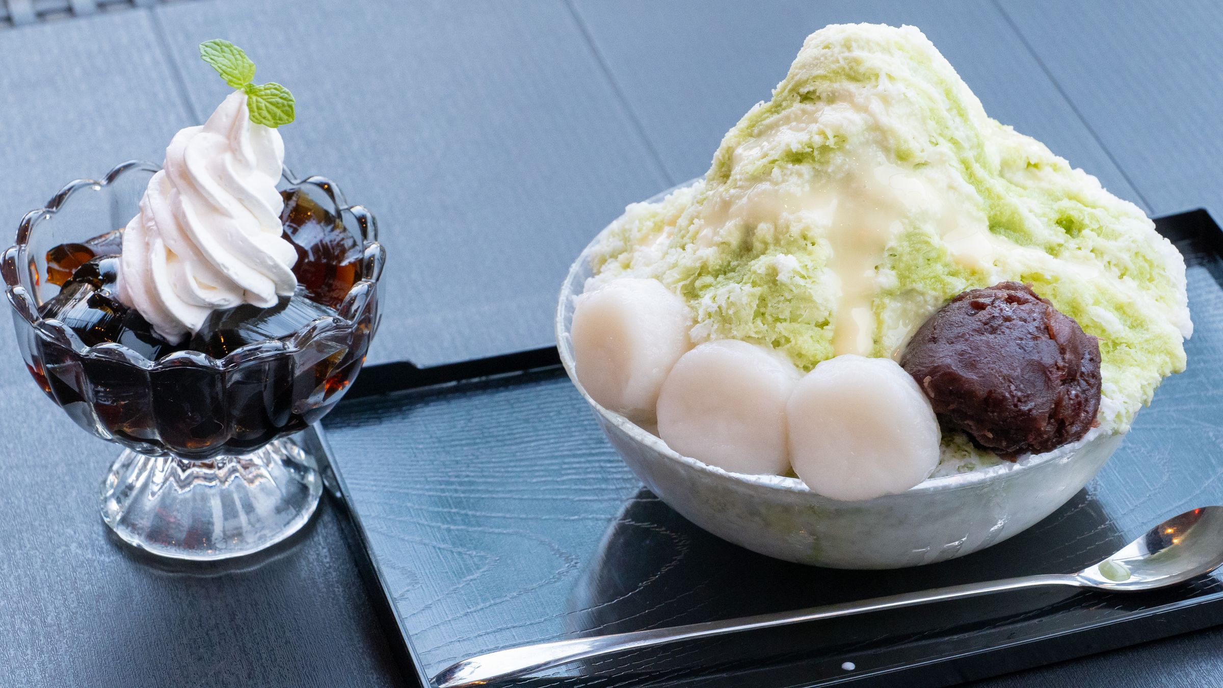 台湾風かき氷は、さらさらのパウダーのような氷にたっぷりと各フレーバーの蜜と練乳などがかかっています。今回はおすすめの「まっちゃ」を試食しましたが、白玉やあんこも乗っていて大満足でした。
