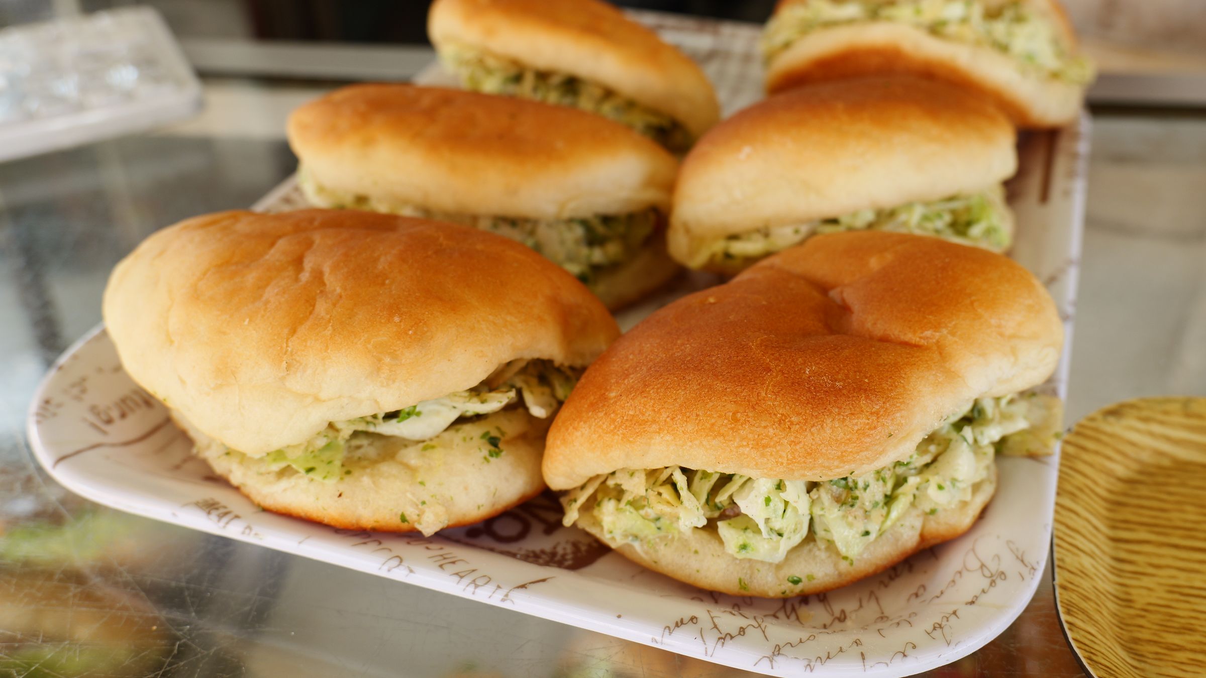 各店でパンの種類や挟む具材などに違いがありますが、中井パン店のポテチパンは、手作業で丁寧に角切りにし水抜きしたキャベツと、ゆでて小さめにカットしたニンジン入り。マヨネーズや塩コショウで味を調えます。
